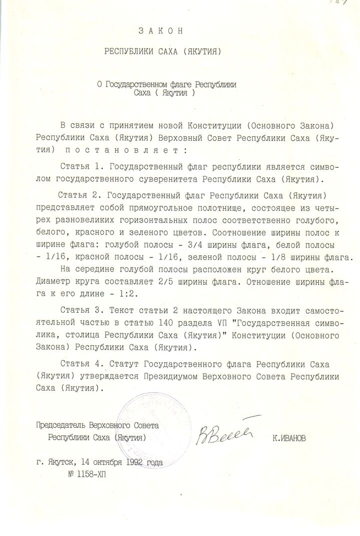 14 октября 1992 г. впервые над зданием Верховного Совета республики был поднят новый четырехцветный флаг Республики Саха (Якутия). Высокая честь водрузить флаг была предоставлена депутатам Тарасу Десяткину, Спартаку Борисову и Николаю Андросову.