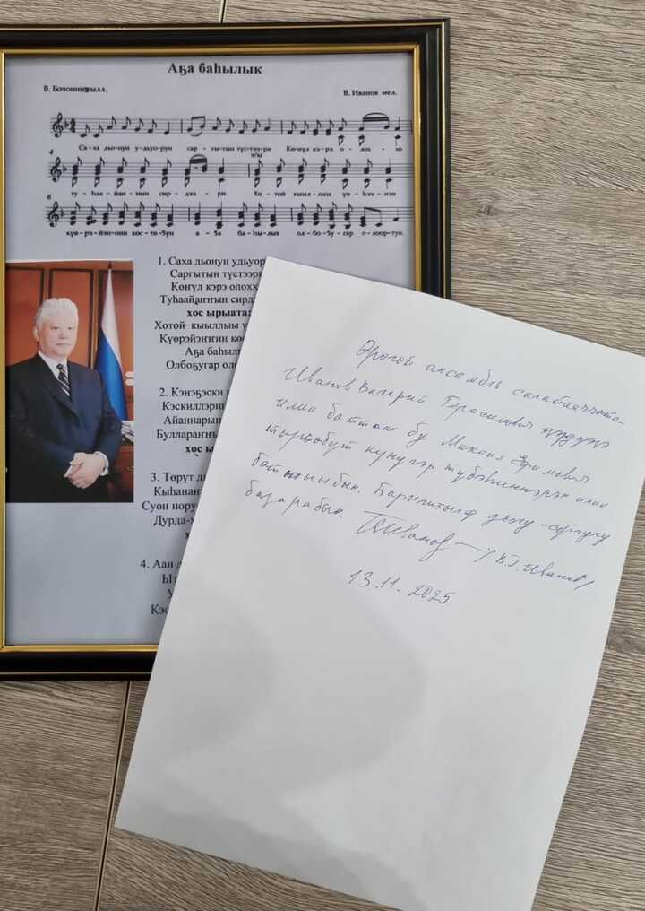 С приветственным словом выступил глава Октемского наслега Александр Большаков. Для участия в праздничном концерте приехали коллективы из Центра духовности “Арчы дьиэтэ” – ансамбль женщин «Чараҥ» и мужской ансамбль «Өрөгөй». Также в праздничной программе принял участие коллектив ветеранов с. Чапаево «Дьиэрэй». Руководитель ансамбля "Чараҥ" Лидия Петрова подарила Николаев-Центру текст и ноты песни "Саха бастакы Президенигэр", автором слов которой сама является. В свою очередь Валерий Иванов, руководитель мужского ансамбля, подарил текст и ноты песни "А5а баһылык" (слова песни принадлежат Валентине Бочониной, музыка - Валерию Иванову).