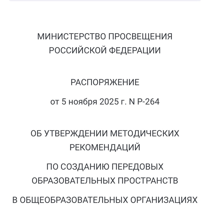 Министерство просвещения РФ распоряжением от 5 ноября 2025 года № Р-264 утвердило методические рекомендации по созданию в общеобразовательных организациях передовых образовательных пространств. Документ опубликован на официальном портале правовой информации.
