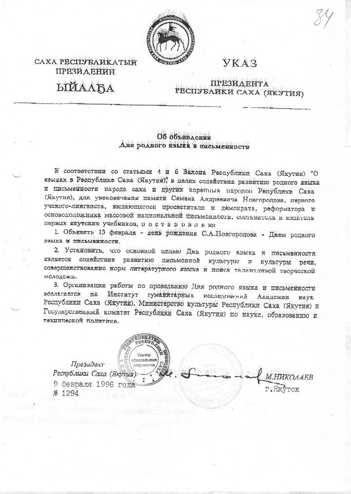 Ежегодно 13 февраля наша республика празднует День родного языка и письменности. Этот праздник был учрежден Указом Президента Республики Саха М.Е. Николаева №1294 от 9 февраля 1996 года. Выбор даты обусловлен днем рождения Семёна Андреевича Новгородова — первого ученого-лингвиста из народа саха, автора якутского алфавита.