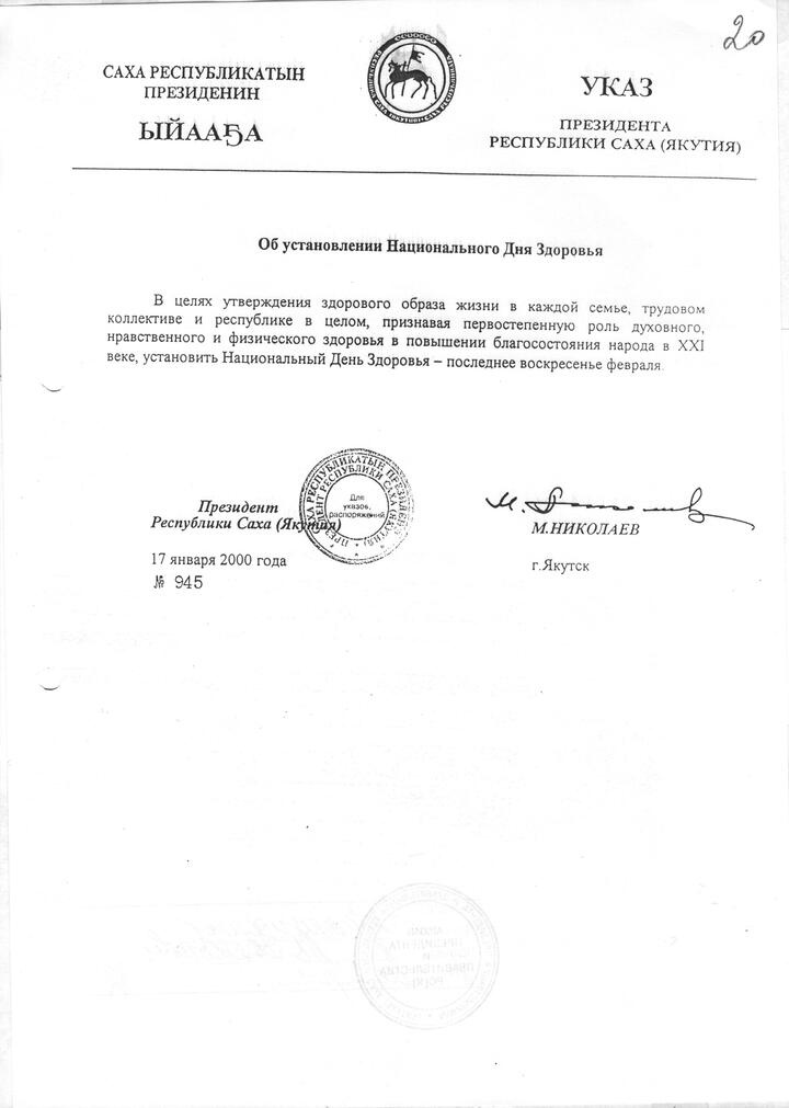 В 2000 году Первый Президент Республики Саха (Якутия) Михаил Ефимович Николаев своим Указом учредил этот праздник, подчеркивающий приоритет заботы о благополучии граждан. Главная цель – популяризация здорового образа жизни среди семей, трудовых коллективов и жителей республики.